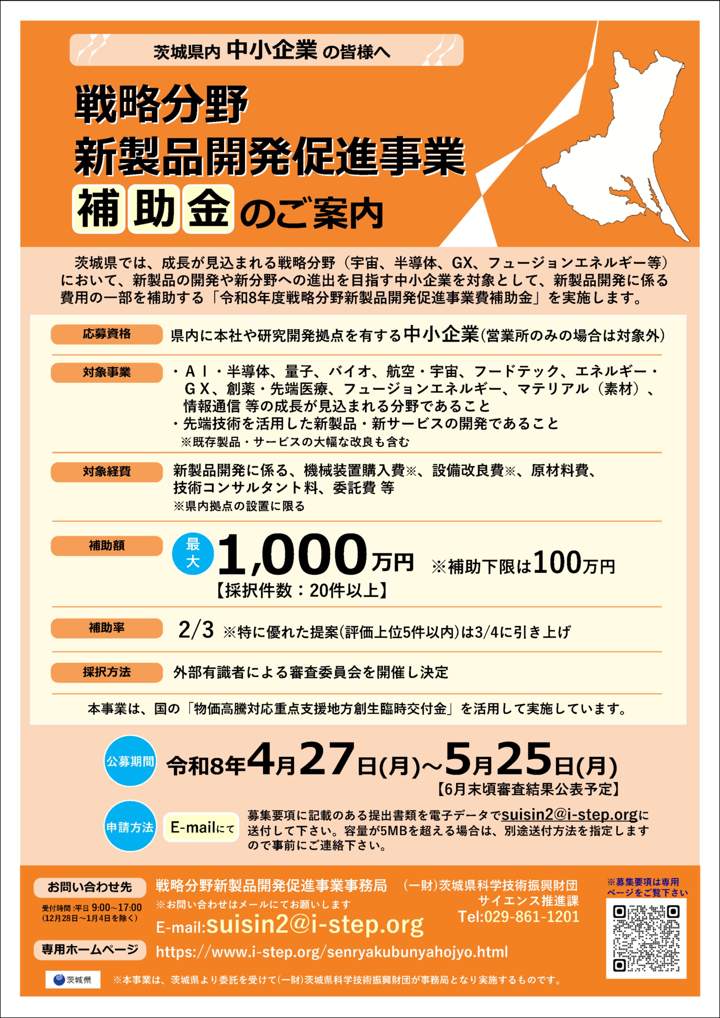 茨城県では、成長が見込まれる戦略分野(宇宙、半導体、GX、フュージョンエネルギー等)において、新製品の開発や新分野への進出を目指す中小企業を対象として、新製品開発に係る費用の一部を補助する「令和8年度戦略分野新製品開発促進事業費補助金」を実施します。